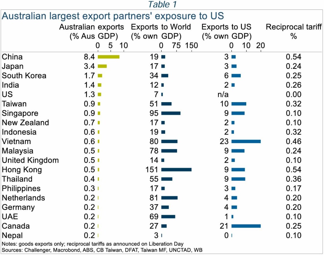 Australia will also see slower growth. We have limited direct exposure to the US economy, but our largest trading partners are more exposed (Table 1). The IMF downgraded its GDP growth forecasts for 2025 by 0.5%. Slower growth, and China’s surplus manufacturing capacity reducing Australian import prices, will lower inflation opening the path to RBA rate cuts. However, market pricing for a cash rate below 3% by December is overdone. With the worst case for US tariffs unlikely to play out, three cuts bringing the cash rate to 3.35%, around its neutral level, seems more likely.