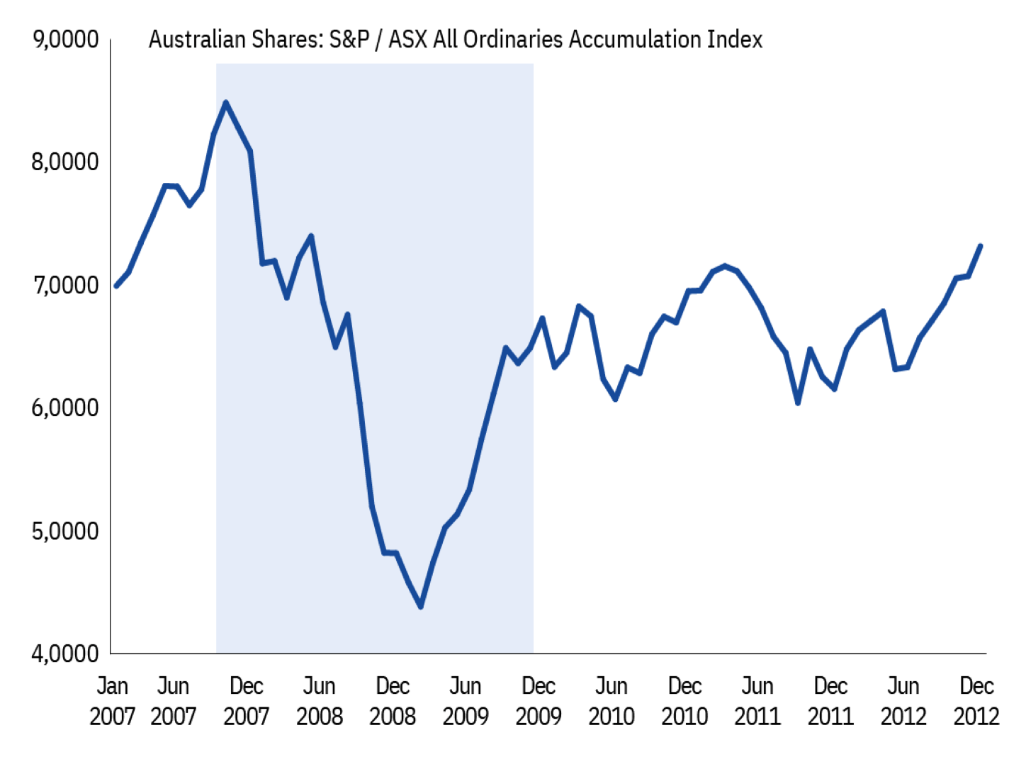 Source: S&P Index Data Services. S&P/ASX All Ordinaries Accumulation Index. Date from 31 January 2007 to 31 December 2012.